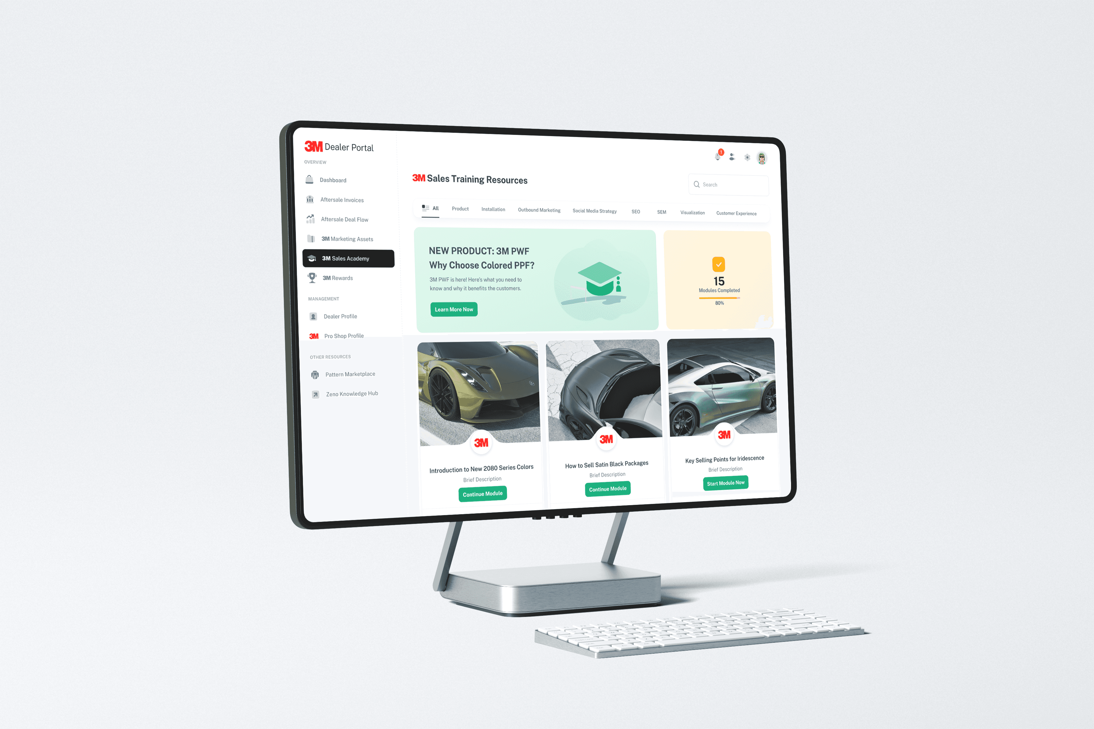 3M needed more than a kiosk. They needed a complete retail experience that would let shop owners visualize wraps in 3D, train their teams on new products, and close bigger jobs on the spot. The challenge was designing a system that worked across every touchpoint — from the physical kiosk hardware to the dealer portal, sales training academy, and go-to-market materials — all under one cohesive brand experience built from scratch.